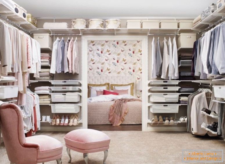 Тъй като обмисляме дизайна на малък двустаен апартамент от 50 кв.м., в спалнята може да има и съблекалня, в ролята на която ще действа например килер. Тъй като производителите на този тип мебели предлагат доста широка гама от довършителни материали за декорация на фасади, възможно е да изберете най-хармоничната опция с избрания стил. За модерни направления е подходящ шкаф с огледални врати за стила на Прованс - с луувър, а класиката предпочита грациозните модели.