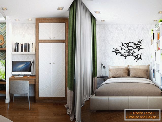 С дизайна на хола 19, 20 кв. М Можете също така да направите дял по зони, като инсталирате огледални врати. Огледалните стени не само защитават интимната зона за спане от любопитни очи, но също така значително разширяват границите на хола и жилищната зона. В този случай е необходимо внимателно да се спазват стилистичните характеристики на цялата стая. Например, огледалата с инкрустация в ориенталски стил не се вписват в класическия стил на интериора.