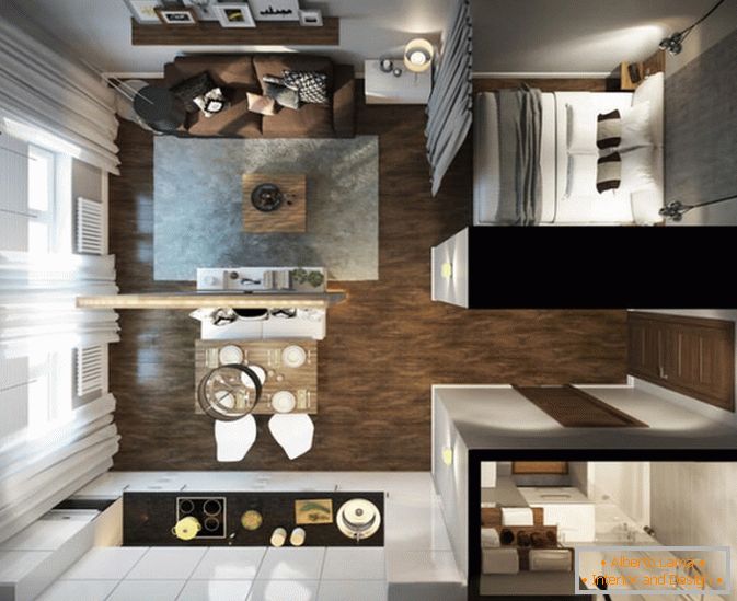 Всички функции на това оформление могат да се включат и изключат по всяко време, както желае собственикът на дома. Но това не е всичко! Дизайнерите са изградили минибар и кафеварка в мобилния дизайн.