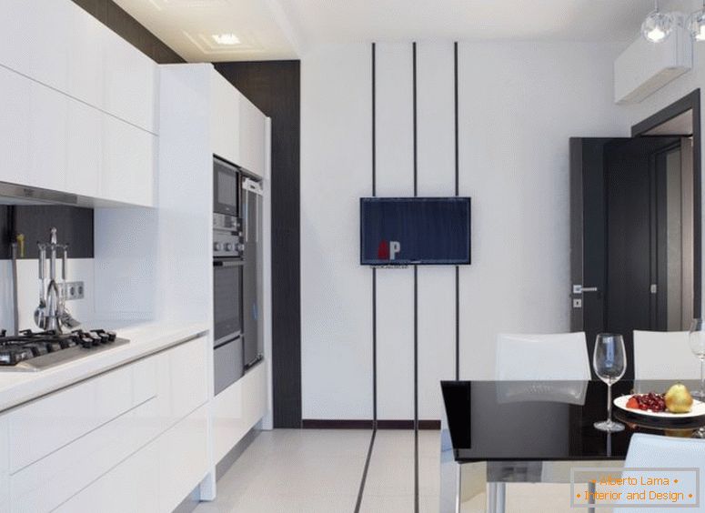 За създаване на специална атмосфера в дизайна, се използва коване. Подготвени са подходящи корнизи, лампи и маса, както и малка пейка по поръчка. Перфектно допълнена от оригиналната идея за избрания текстил - хармонията на велур и изкуствен лен. Рамката на Ikea, окачени гърнета и гардероби са станали красиви и удобни интериорни детайли. Елементи от керамични с глазура (вази с цветя, стомна, още един саксии на скрина, оригинални свещници във формата на риба, фоторамки със снимки на пътувания, на няколко морски отпечатъци) дадоха цялостния дизайн на пълнота.