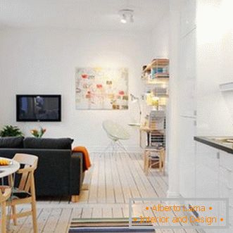 Площта на малкия студио апартамент, след промените, придобива специален чар и неописуем чар, които се поддържат в строителните материали, използвани в довършителните работи: бетонни повърхности, рафинирана дървесина и естествени материали. Неизличимо впечатление произвежда само креслото на автора с петна!
