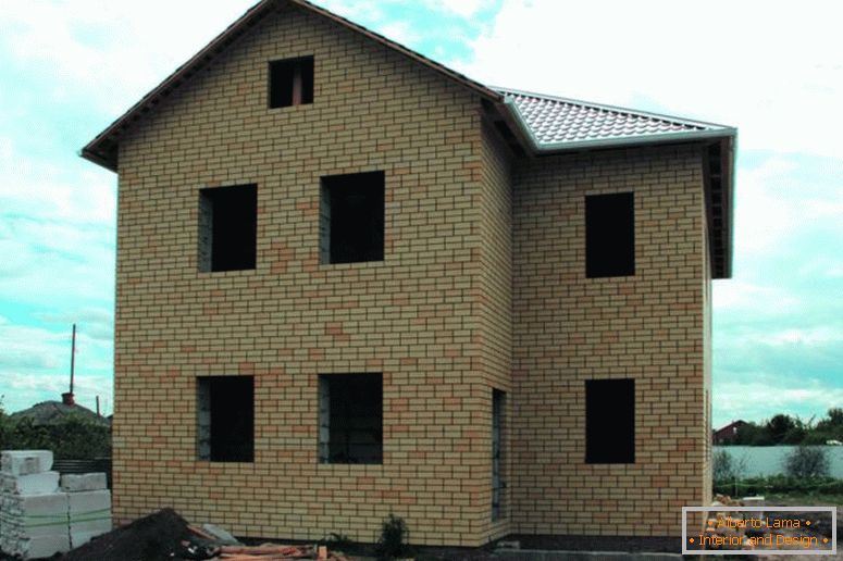 Цветът във вътрешността разделя помещението на зони. Подът в трапезарията е облицован с леки керемиди със зелени бои. Преди дивана е килим с бургундски тъмен шаблон и определя границите на хола. Тапицерията на мебелите е с антрацитен тон и се отличава със светъл фон. Като декорация са използвани зидани измазани стени.