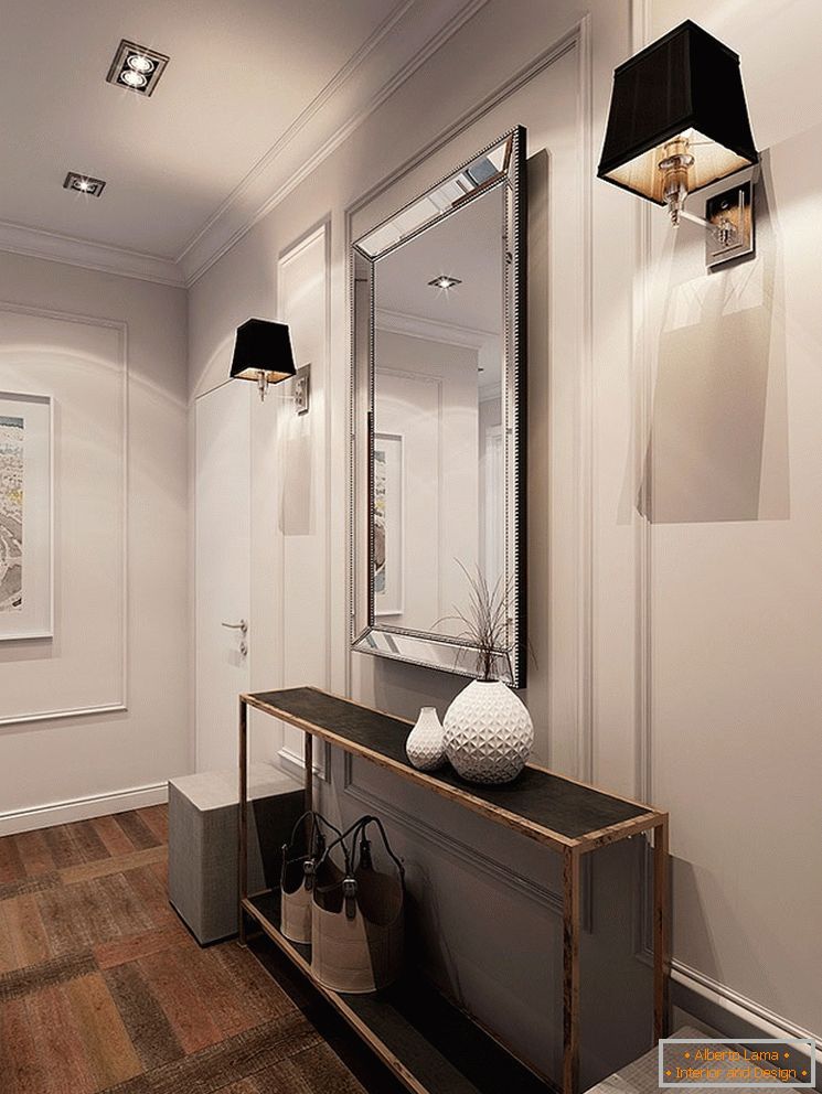 На балкона, с изглед към двора на сградата, лаконично обзавеждане с интересни възглавници. На входа на апартамента обръщате внимание на антични шкафове, които се отличават с общ фон.
