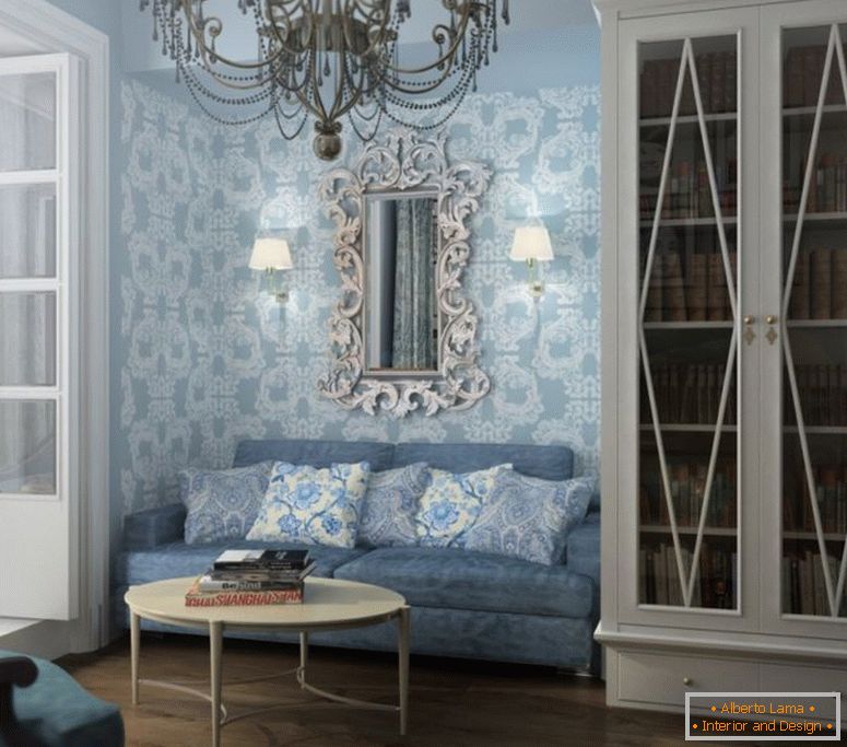 Дневната е направена в сиво. На пода - корица с шаблон "в коледната елха". Най-интересните елементи в стаята са картините с изображения на планини и модулна маса, разположена срещу канапето сиво-блато.