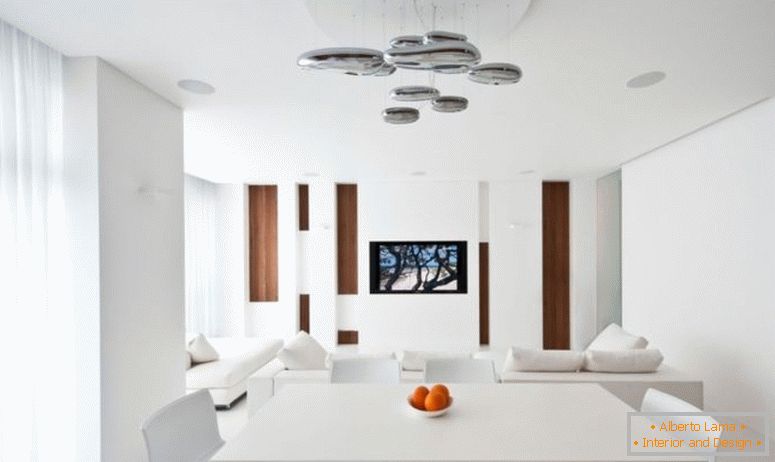 За същата цел стените са украсени с голям брой картини и дървен панел за фиксиране на телевизора. В допълнение към хоризонталния декор, той е оборудвал зоната на хола с мощна плоска лампа, която се превръща в централен акцент, създавайки още по-голям обем.