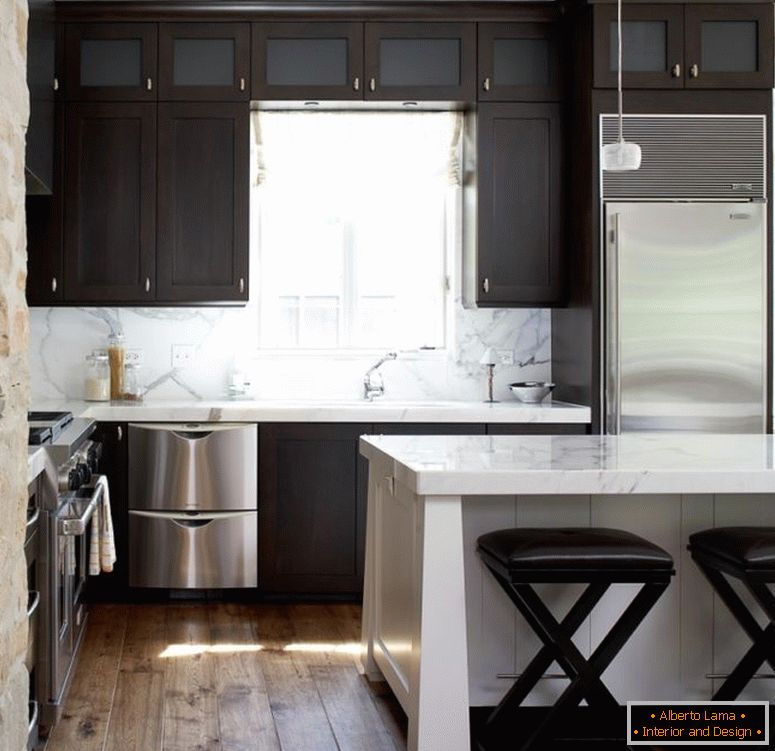 Въпреки това, нека да се върнем към истинските цветове на средиземноморския стил. Цветът на стените е бял, но оцветяването на врати, прозоречни рамки, прозоречни первази, различни структурни елементи, като таванни греди, шкафовете могат да бъдат направени в сини или кафяви тонове. Черният цвят не е добре дошъл: изглежда неестествено, сякаш сте на шахматна дъска, а не на Cote d'Azur.